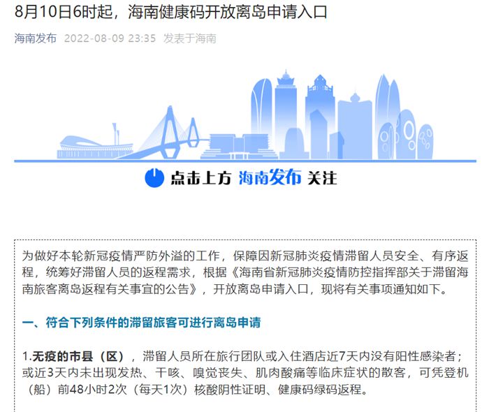 为做好本轮新冠疫情严防外溢的工作,保障因新冠肺炎疫情滞留人员安全、有序返程,统筹好滞留人员的返程需求,根据《海南省新冠肺炎疫情防控指挥部关于滞留海南旅客离岛返程有关事宜的公告》,开放离岛申请入口,现将有关事项通知如下。