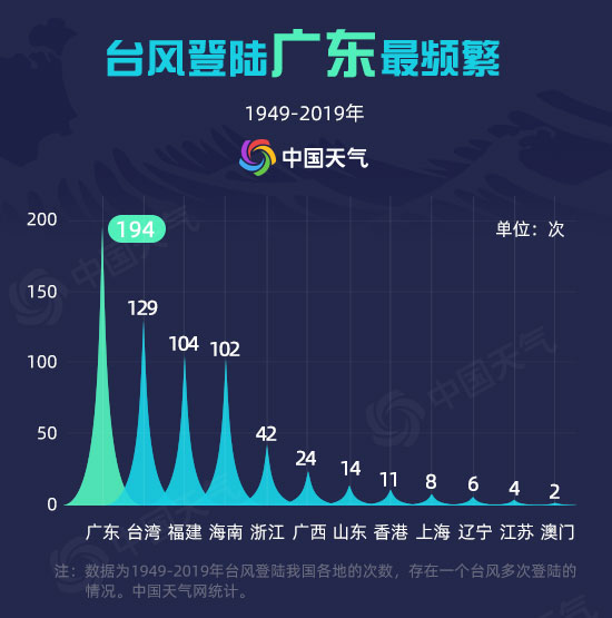 统计显示,截至2019年,共有189个台风登陆过广东,由于部分台风存在多次登陆的情况,这189个台风共计登陆广东194次,台风登陆广东的个数和次数均为全国之首。台风登陆台湾、福建、海南的次数均超过100次。
