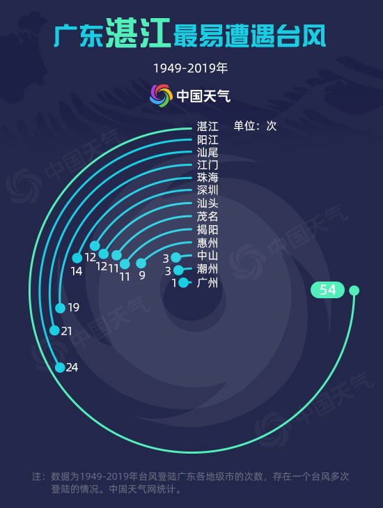 从登陆地点来看,广东沿海从东到西都有台风登陆过,一般来说,西部沿海比东部沿海更易招来台风,尤其是雷州半岛一带是台风登陆广东最多的地区。根据中国天气网大数据显示,湛江是台风登陆次数最多的地区,1949-2019年期间,台风登陆湛江共计54次,而湛江地区的徐闻县则是最易遭遇台风的县市,台风登陆次数达21次。