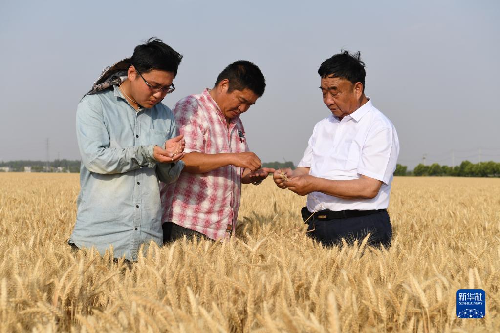 在安徽太和县淙祥现代农业种植专业合作社,徐淙祥(右)和儿子徐健(中)、孙子徐旭东察看即将收获的麦穗(2022年6月1日摄)。新华社发(徐旻昊 摄)