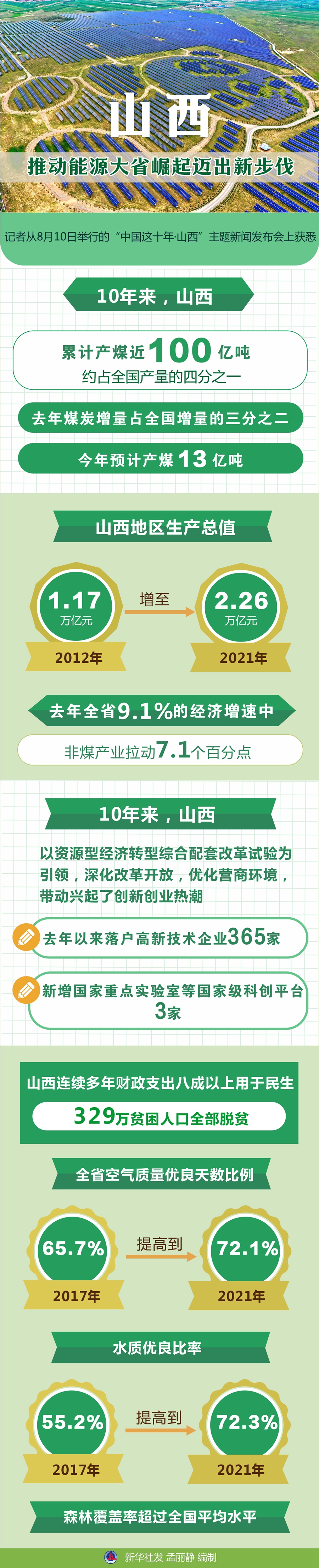 10年来,山西地区生产总值从2012年的1.17万亿元增至2021年的2.26万亿元。做大总量的同时,山西一手抓煤、电、钢、焦等传统优势产业改造提升,一手抓高端装备制造、新材料、大数据等战略性新兴产业发展壮大。去年全省9.1%的经济增速中,非煤产业拉动7.1个百分点。