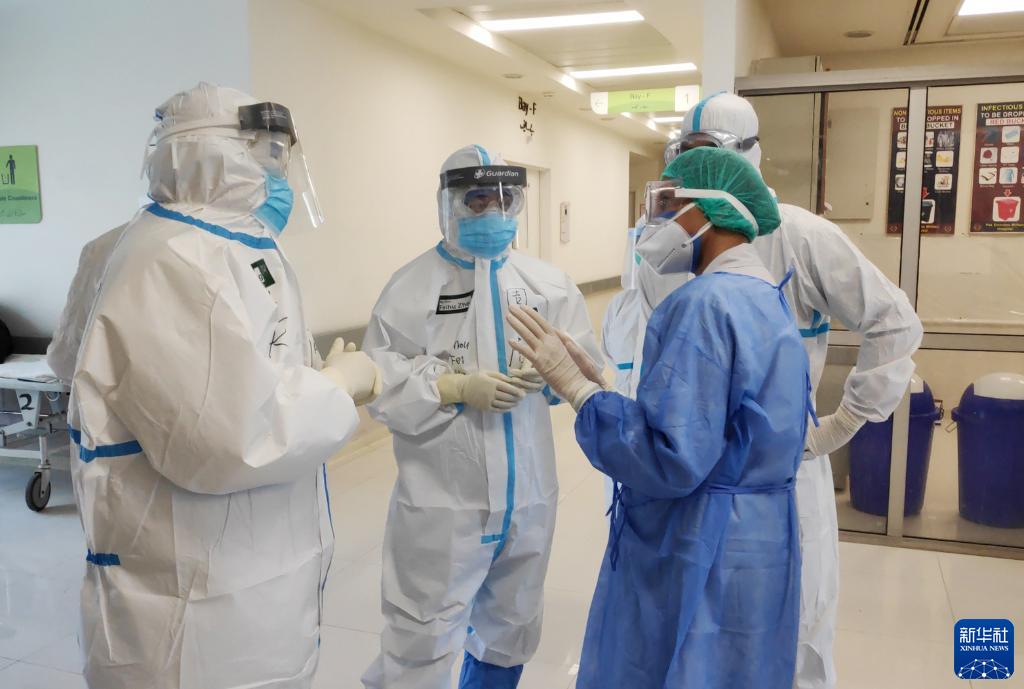 解放军总医院第一医学中心重症医学科主任周飞虎(左二)在巴基斯坦定点医院病房指导当地医护人员工作(2020年5月21日摄)。新华社发