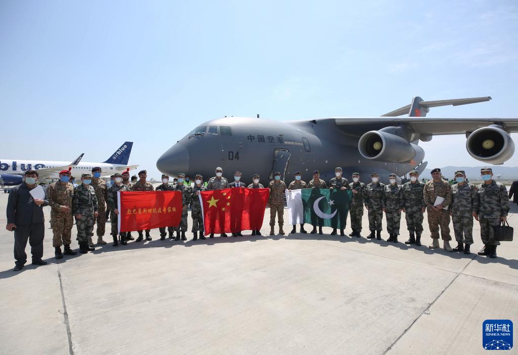解放军总医院第一医学中心重症医学科主任周飞虎(右十二)带领医疗队抵达巴基斯坦指导疫情防控(2020年4月25日摄)。新华社发