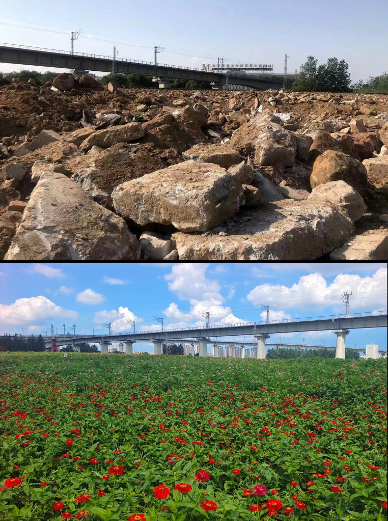 上图为2021年日照市东港区迎宾路和青盐高铁交会而成的11万平方米长方形地带未治理前的样子。下图为引入“超高温好氧发酵”技术,用“碳汇”模式进行治理后的样子(2022年8月1日摄)。(受访者供图)