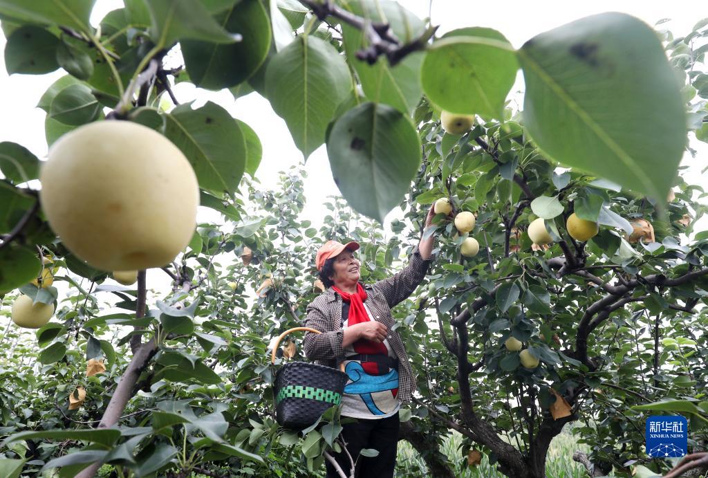 8月13日,在河北省晋州市桃园镇桃园村梨园种植基地,梨农在采收皇冠梨。