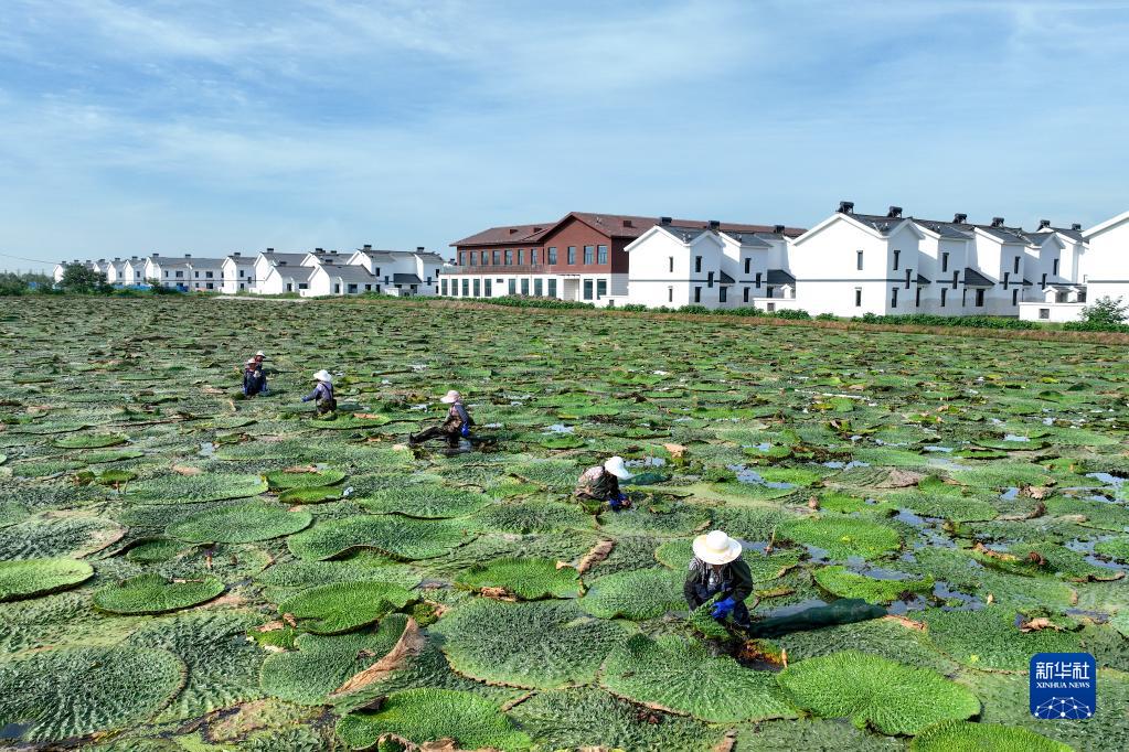 8月13日,在江苏省淮安市洪泽区岔河镇,农民在采收芡实(无人机照片)。