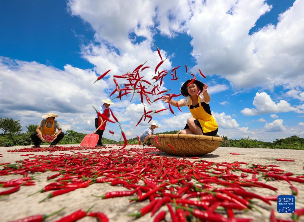 8月13日,村民在贵州省黔东南苗族侗族自治州岑巩县平庄镇包东村晾晒辣椒。