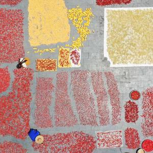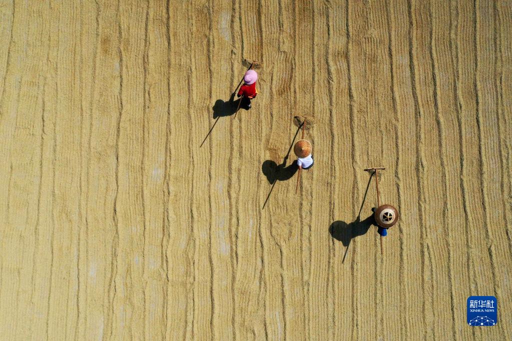 8月14日,村民在贵州省黔东南苗族侗族自治州岑巩县思旸镇坪坝村晾晒种稻(无人机照片)。
