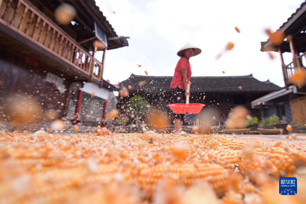 8月14日,村民在贵州省黔东南苗族侗族自治州岑巩县注溪镇衙院村晾晒玉米。