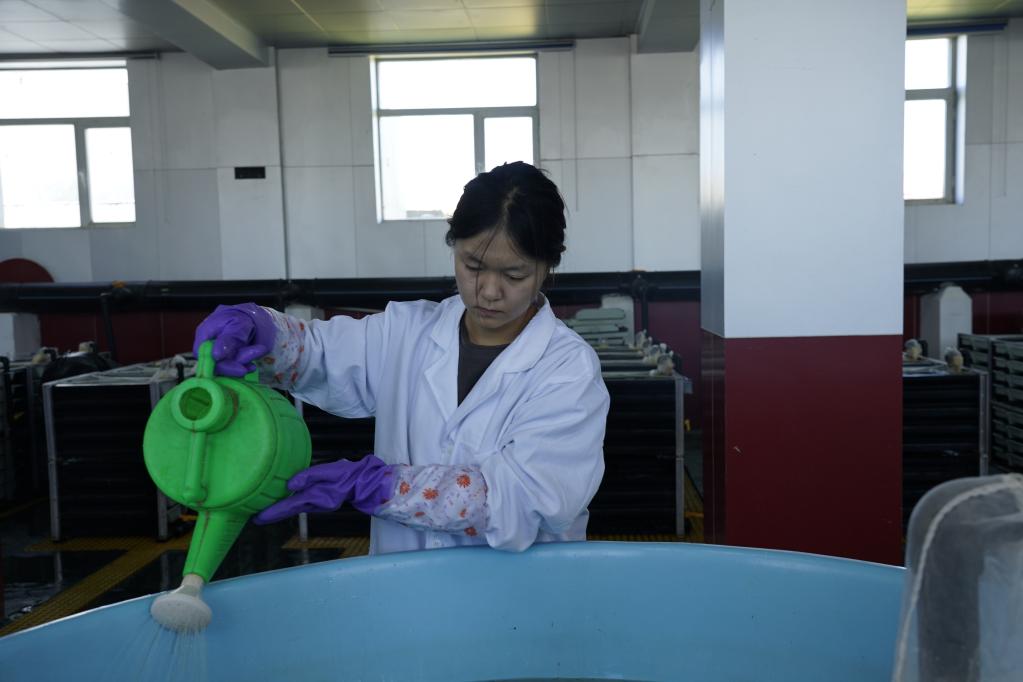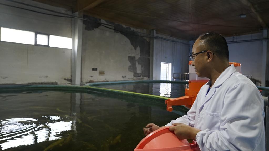 8月8日,青海湖裸鲤救护中心的工作人员为繁育车间里的湟鱼喂食。新华社记者陈杰 摄