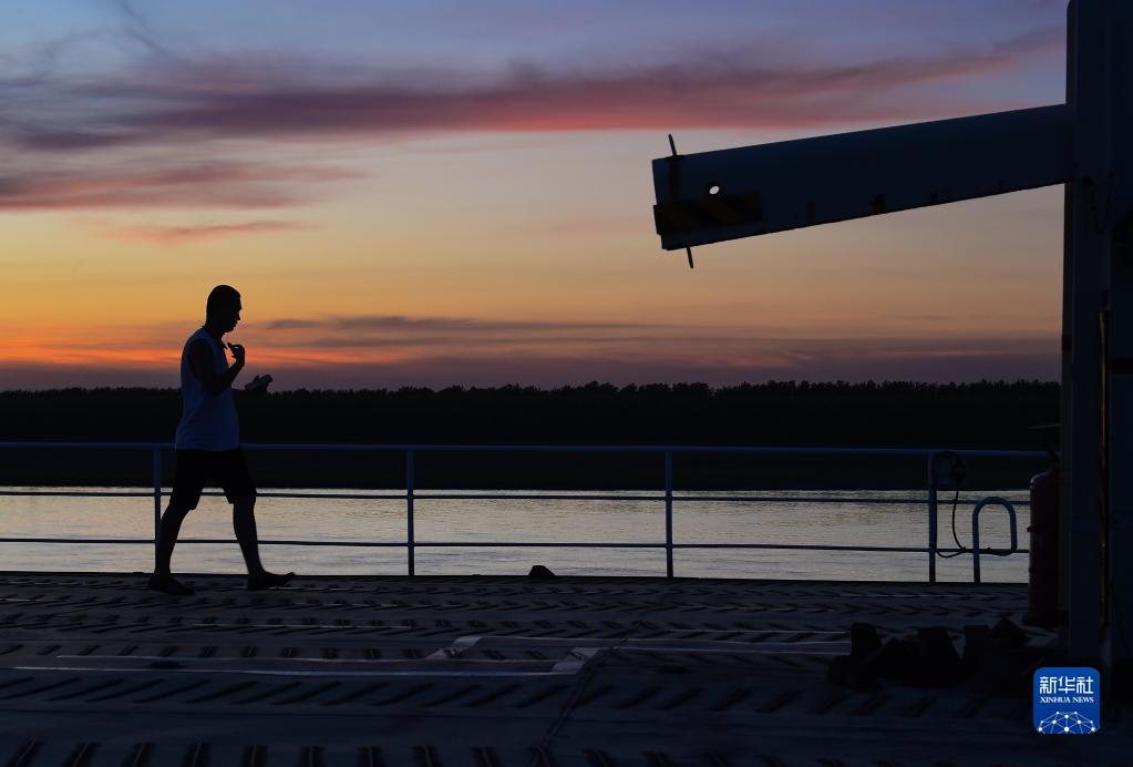 二副李行在傍晚结束工作后,来到最顶层货舱平台的开阔处锻炼(8月10日摄)。看书、看电视、健身是船员们闲暇时放松的主要方式。