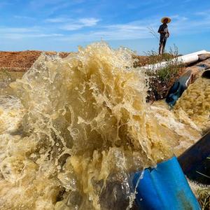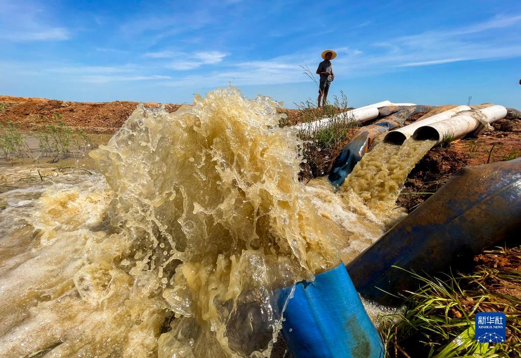 8月13日,在江西省九江市都昌县周溪镇一处稻田,农民利用抽水泵灌溉保苗。