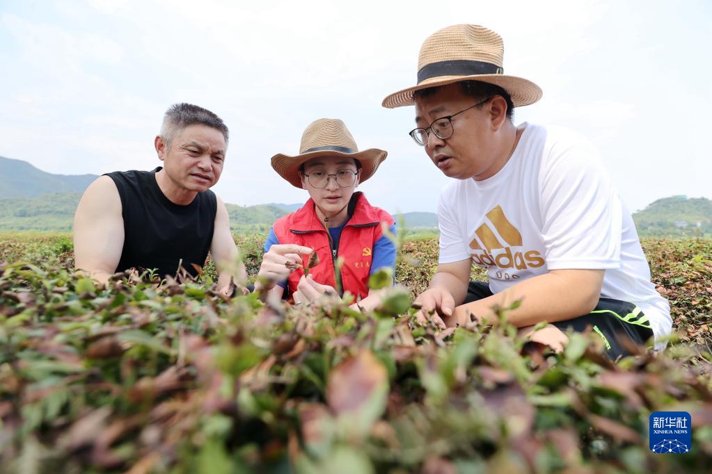 8月14日,在浙江省湖州市德清县莫干山镇劳岭村生态茶园,农技人员指导茶农抗旱。