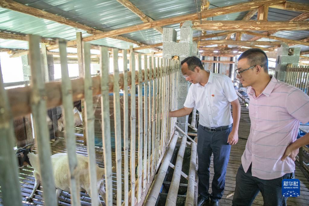 8月11日,在重庆市巫溪县田坝镇双箭村,驻村第一书记廖正步(左)和驻村队员在查看牲畜养殖情况。