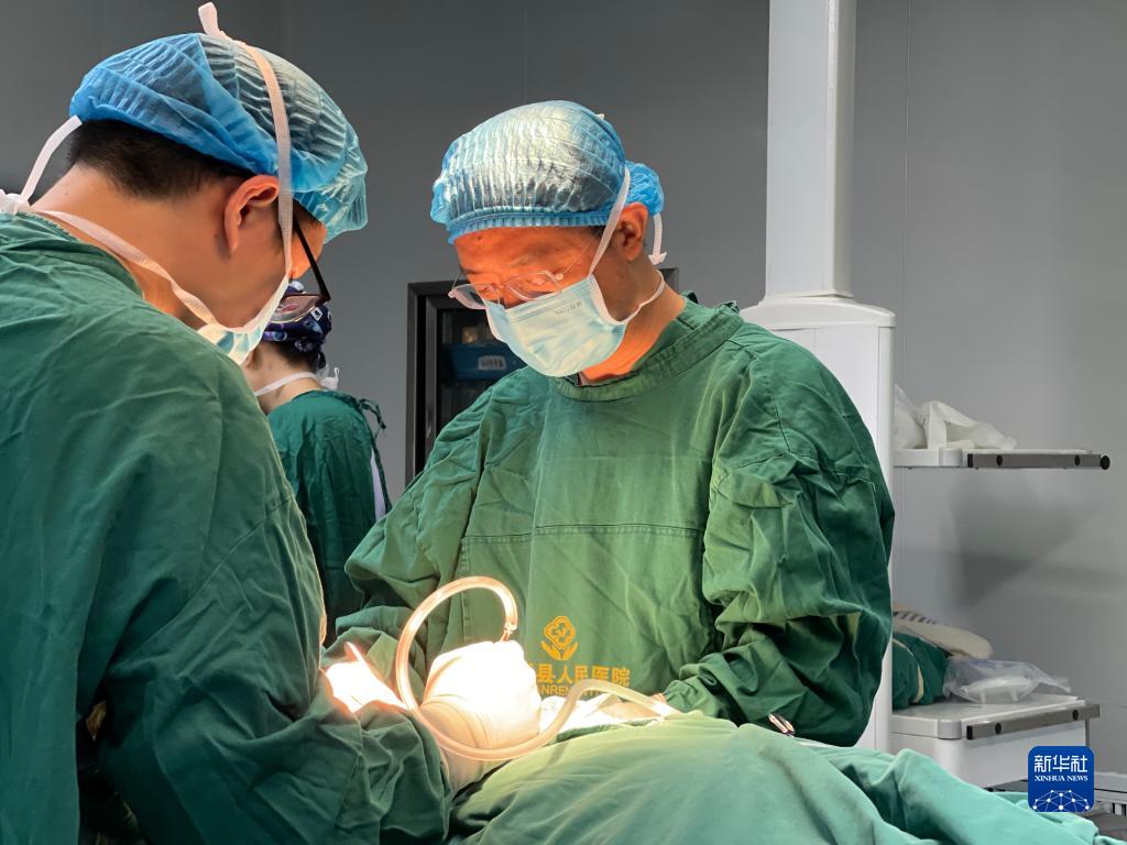 8月10日,在重庆市巫溪县人民医院,田坝镇双箭村驻村第一书记廖正步(右)与当地医生一起进行手术。