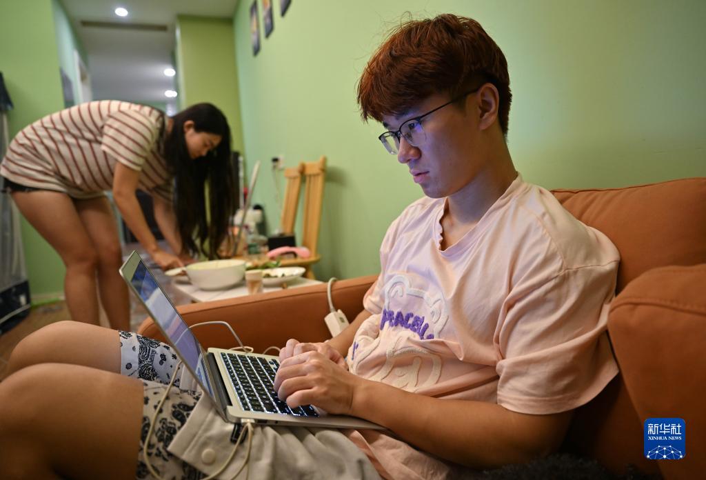 8月14日晚,张海洋(右)在家中上网课。他在俄罗斯阿列赫姆国立大学读研二,受俄罗斯疫情影响,目前在国内通过网络上课。