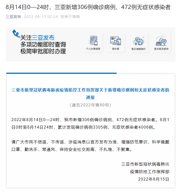 2022年8月14日0—24时,三亚市新增306例确诊病例、472例无症状感染者。8月1日0时至8月14日24时,累计发现确诊病例3305例、无症状感染者4006例。