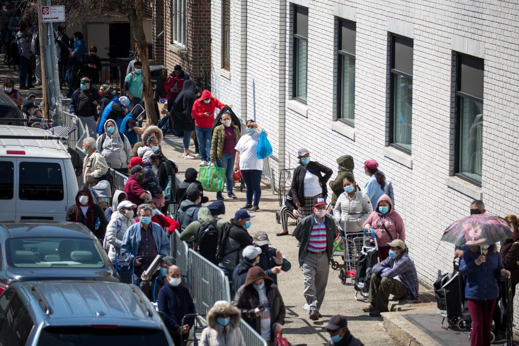 2020年5月14日,人们在美国纽约一个免费食品发放点排队等待。(新华社发 郭克摄)