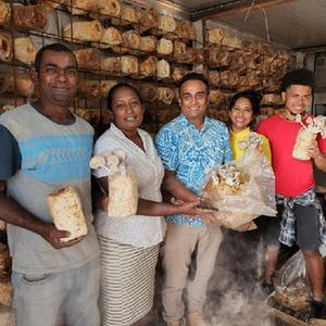 5月11日,在斐济第三大城市楠迪,一家斐济蘑菇公司员工展示在中国援斐菌草技术示范中心项目帮助下种植的蘑菇。新华社记者 张永兴 摄