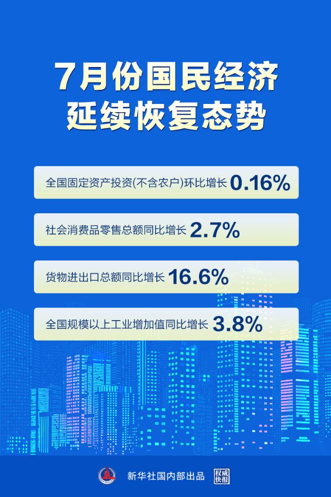 新华社北京8月15日电(记者魏玉坤、王雨萧)国家统计局15日发布数据显示,7月份,生产供给继续恢复,就业物价总体平稳,对外贸易增势良好,民生保障有力有效,国民经济延续恢复态势。