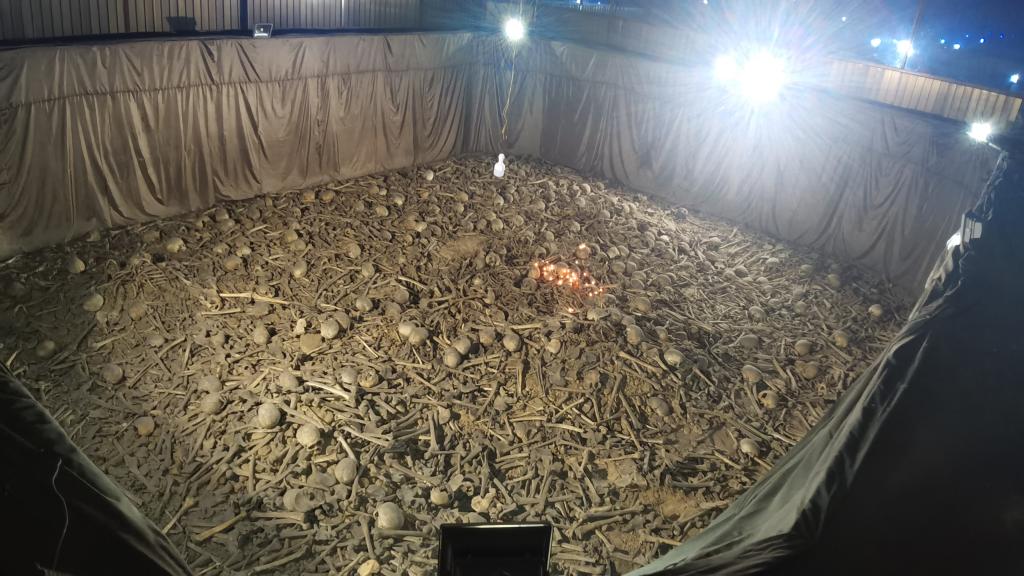 1968年10月,原鹤岗矿务局挖掘了长约40米、宽约30米、深近7米的“万人坑”一角,仅在一处80平方米的挖掘角内,就发现千余具遗骨。有的遗骨被打折了脊柱,有的头颅被子弹打穿,还有多具遗骨的眼眶被铁丝穿过连在一起……