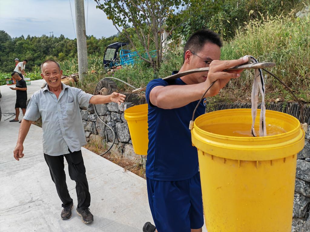 十堰市消防救援支队消防员为受旱地区群众送水。(十堰市消防救援支队供图)