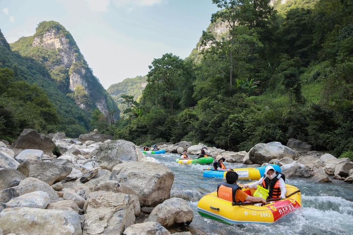 8月4日,游客在贵州省施秉县杉木河景区漂流。新华社记者 刘续 摄