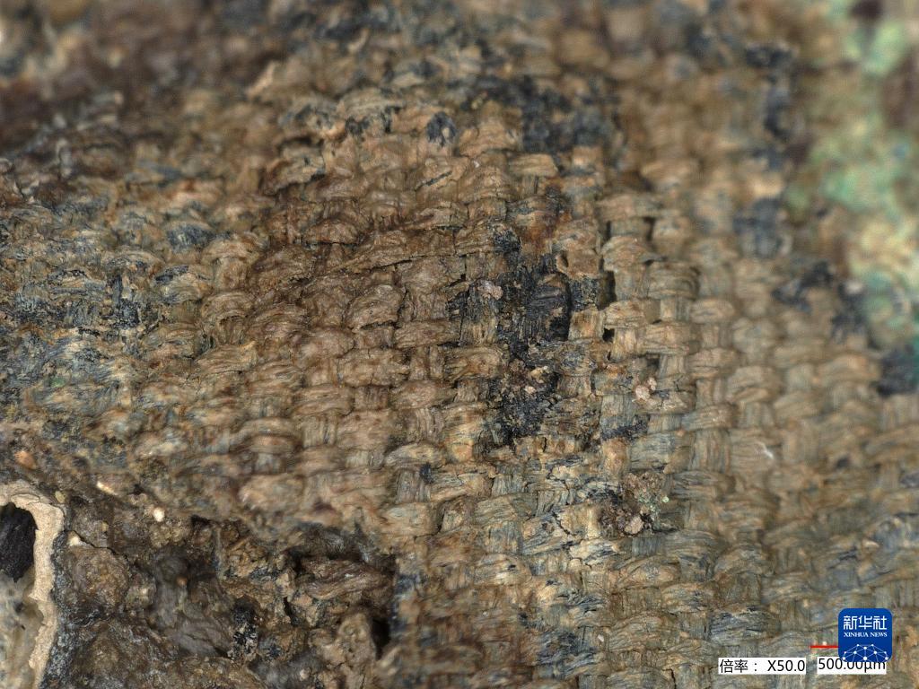 这是位于四川省广汉市的三星堆祭祀区考古发掘现场8号“祭祀坑”青铜残片上的丝绸残留物。新华社发(四川省文物考古研究院供图)