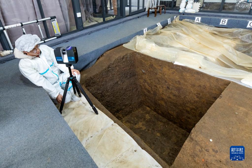 在三星堆遗址考古发掘现场,考古人员用三维激光扫描仪扫描7号“祭祀坑”,并将利用扫描数据建立该“祭祀坑”的3D模型(2021年3月10日摄)。新华社记者 沈伯韩 摄