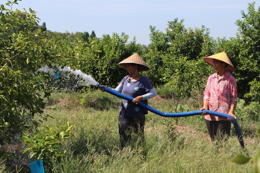 在重庆潼南区柏梓镇果树种植基地,农户引水灌溉缓解旱情。(受访者供图)