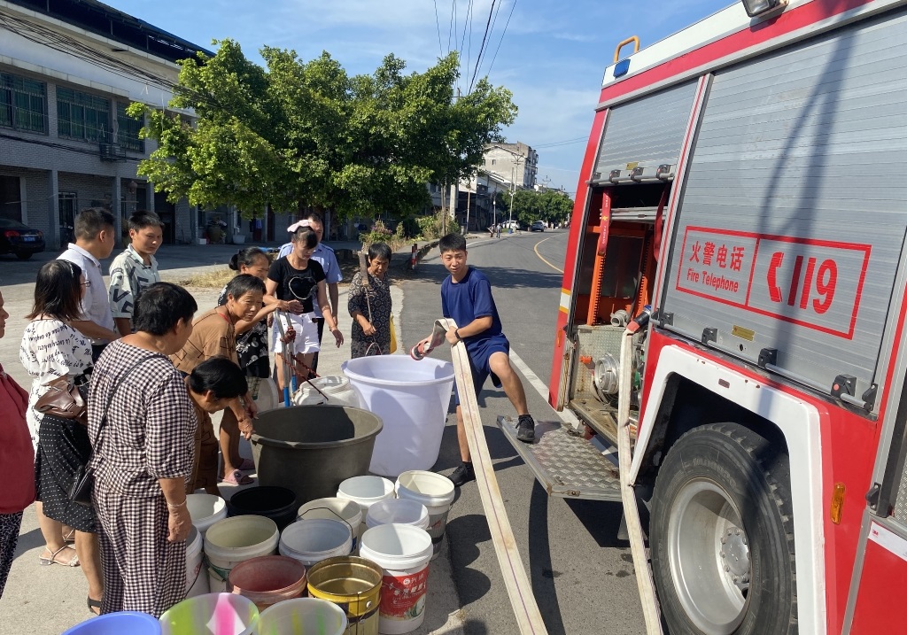 连日高温天气还使得重庆部分乡镇农村出现不同程度的用水短缺情况。重庆永川区何埂镇的两个村取水困难,近千名群众日常生活受到影响。当地消防部门对消防车水箱、水枪等供水器材进行清洗,为村民送上“及时水”。“消防车来了,大家快来接水呀!”不一会儿,由消防车组成的临时“水站”就排起了长队。消防员一边维持秩序,一边帮忙接水提水。
