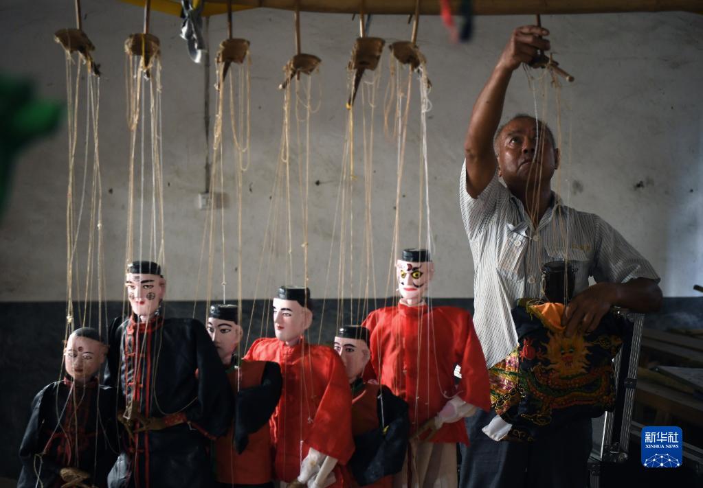 在江西省广昌县塘坊镇淇田村,木偶剧团成员在收拾木偶,准备前往大株村演出(8月10日摄)。