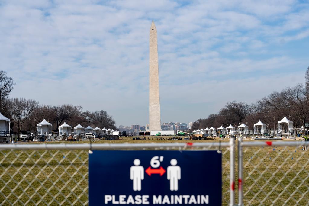这是2021年1月13日在美国华盛顿国家广场透过隔离围栏拍摄的华盛顿纪念碑。新华社记者刘杰摄