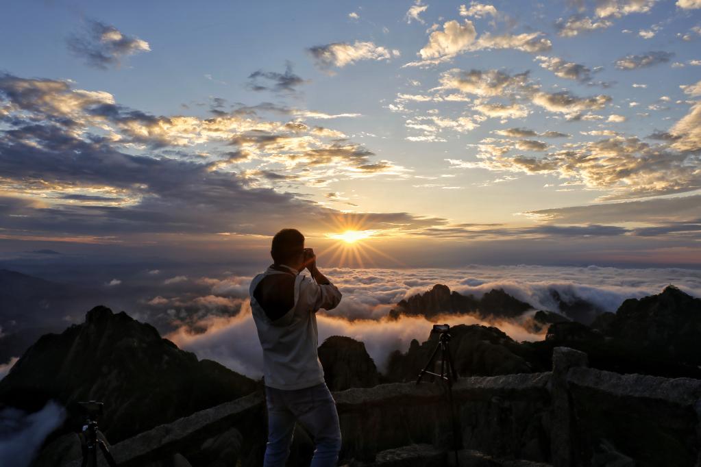 游客拍摄黄山云海(6月2日摄)。新华社发(梅建 摄)