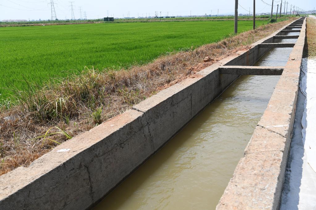 沿着主灌渠来到不远处一个二级提灌站——树下提灌站,河水经提灌后进入农田边上的灌溉渠,田间是一片绿油油的水稻。