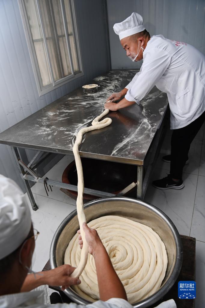 8月16日,儿子李念平(右)配合父亲在进行空心挂面的“搓条盘面”工序。