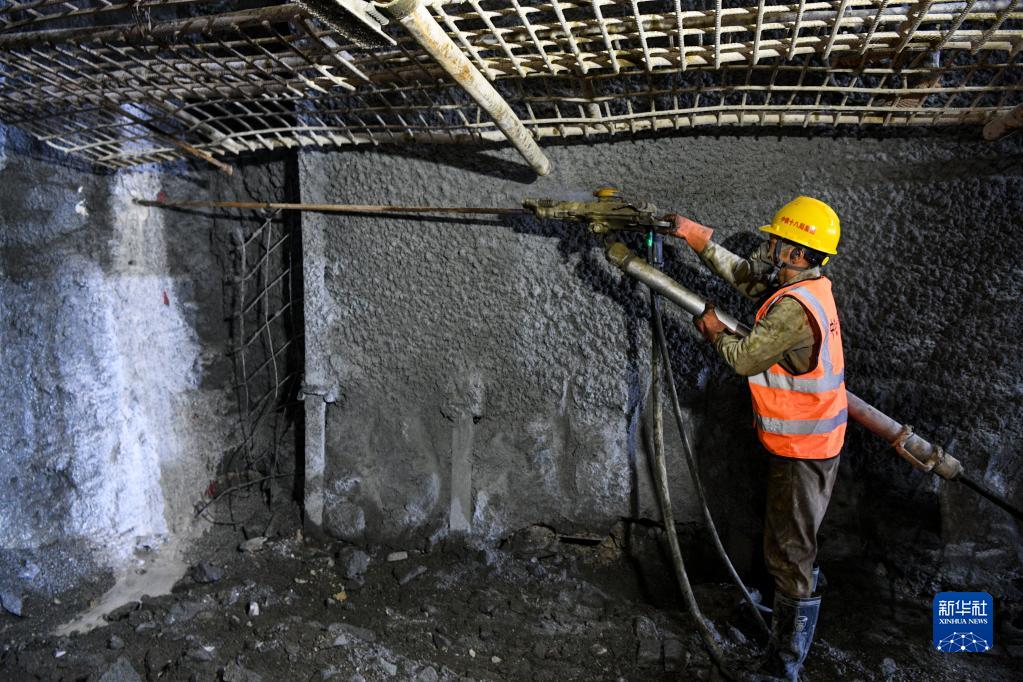 8月16日,在位于广西环江毛南族自治县的贵南高铁九万大山四号隧道内,工作人员用风枪打爆破眼。