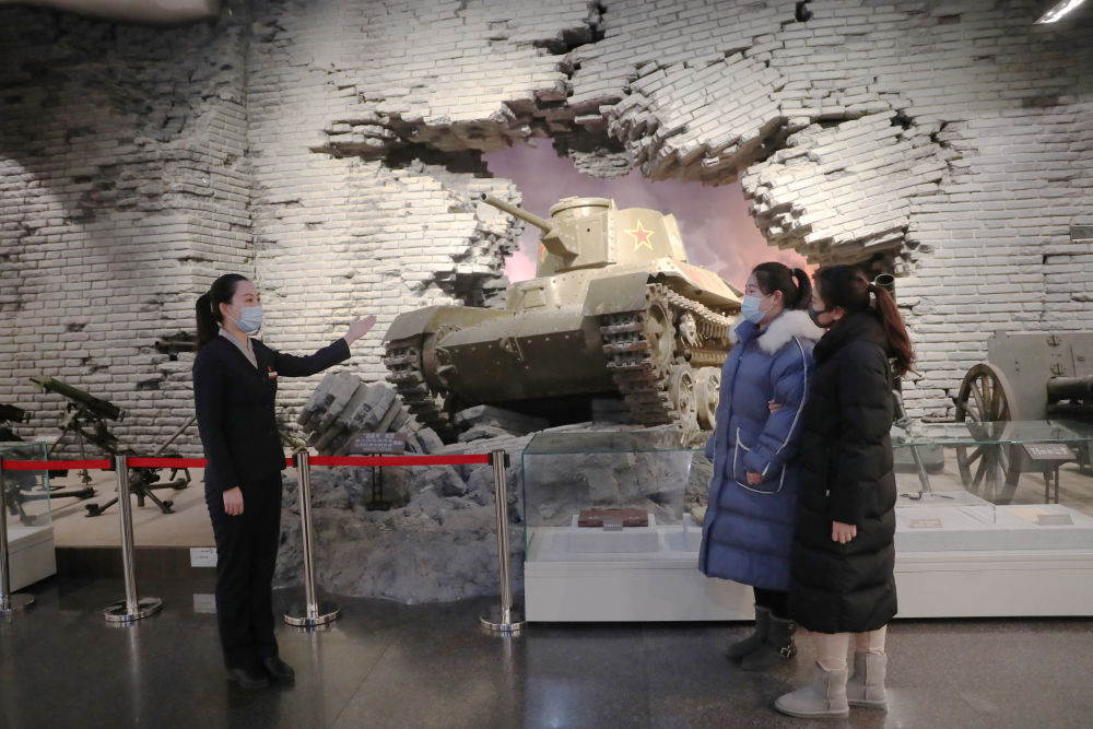 ↑辽沈战役纪念馆讲解员为观众介绍人民解放军攻城部队攻破锦州城垣复原景象(2021年2月2日摄)。