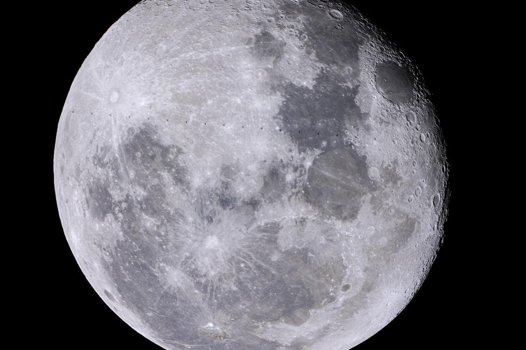 在8K相机拍摄的画面中,可以清晰地看到中国空间站的天和核心舱与问天实验舱组成“土”字型结构,并与月球表面的静海、第谷环形山等区域合影。