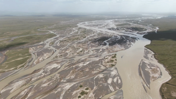 在长江正源沱沱河和南源当曲汇合的囊极巴陇,不同时期的卫星图像清晰显示,江源水系河道冲淤频繁,水流不断分汊又汇集,鸟瞰就像在大地上扎起许多小辫子。