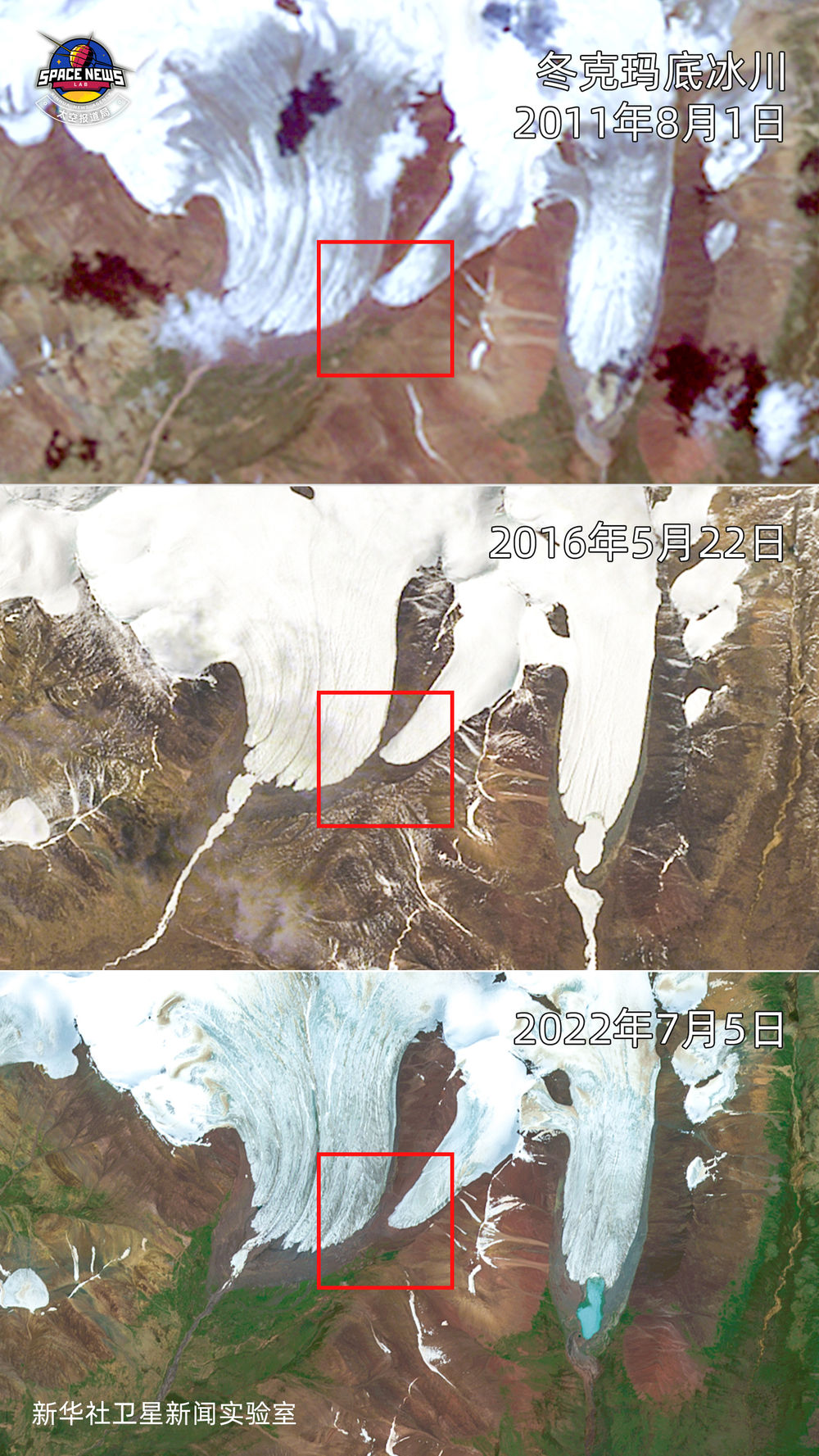 从冬克玛底冰川不同年份卫星遥感图像可以看出,在2011年冬克玛底冰川还是一个整体,此后就陆续分为大、小冬克玛底两条冰川。红框区域内变化,说明两条冰川末端之间距离逐渐拉大,处于消融退缩。