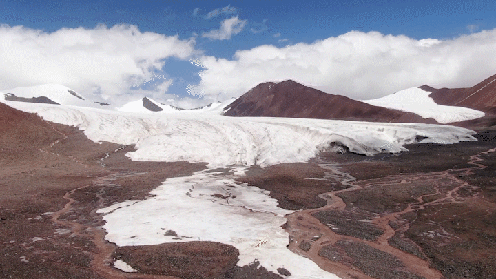 抬头,是皑皑白雪冰川;脚边,是冰雪融水奔流。厚厚冰盖嵌入山谷中,冰川融水随着河谷顺势而下,汇入长江源水系。