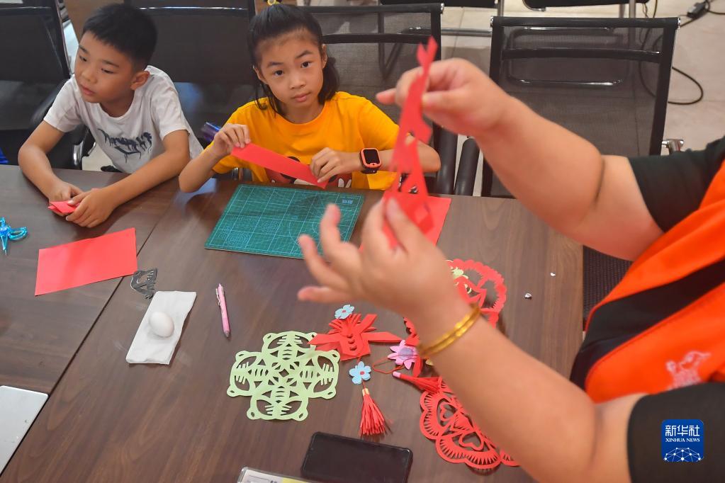 8月17日,在湘潭市雨湖区窑湾街道唐兴寺社区,小朋友在听志愿者讲解剪纸的技巧。