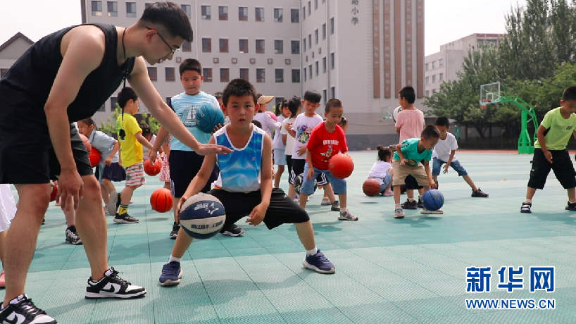 沈阳市宁山路小学暑期托管班老师指导学生运球。新华网 唐晓瑭摄