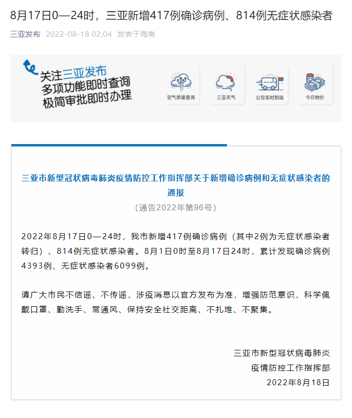 2022年8月17日0—24时,我市新增417例确诊病例(其中2例为无症状感染者转归)、814例无症状感染者。8月1日0时至8月17日24时,累计发现确诊病例4393例、无症状感染者6099例。