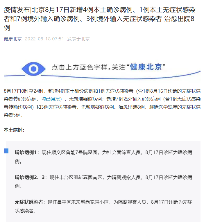 【原标题】疫情发布丨北京8月17日新增4例本土确诊病例、1例本土无症状感染者和7例境外输入确诊病例、3例境外输入无症状感染者 治愈出院8例