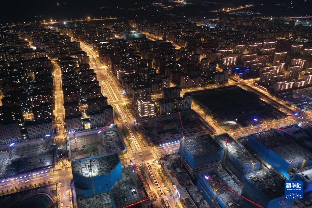 河北雄安新区容东片区及雄安·电建智汇城建设项目夜景(8月17日摄,无人机照片)。