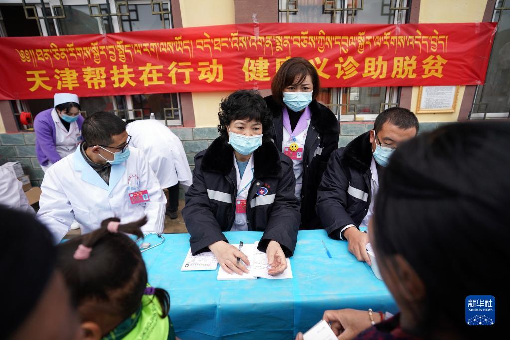 在西藏昌都市江达县卡贡村,天津援藏医生王佩华(中)为村民义诊(2020年9月26日摄)。新华社记者 詹彦 摄