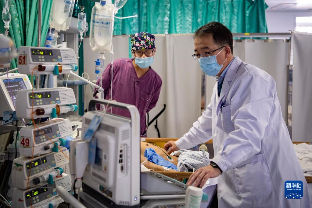 北京援藏医生王小亭(右)在西藏自治区人民医院病房为病人做重症超声评估(2020年2月23日摄)。新华社记者 孙非 摄
