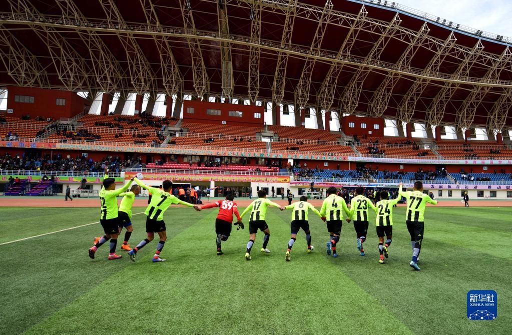 在拉萨市群众文化体育中心,足球队员在比赛后奔跑欢呼(2018年5月11日摄)。新华社记者 晋美多吉 摄